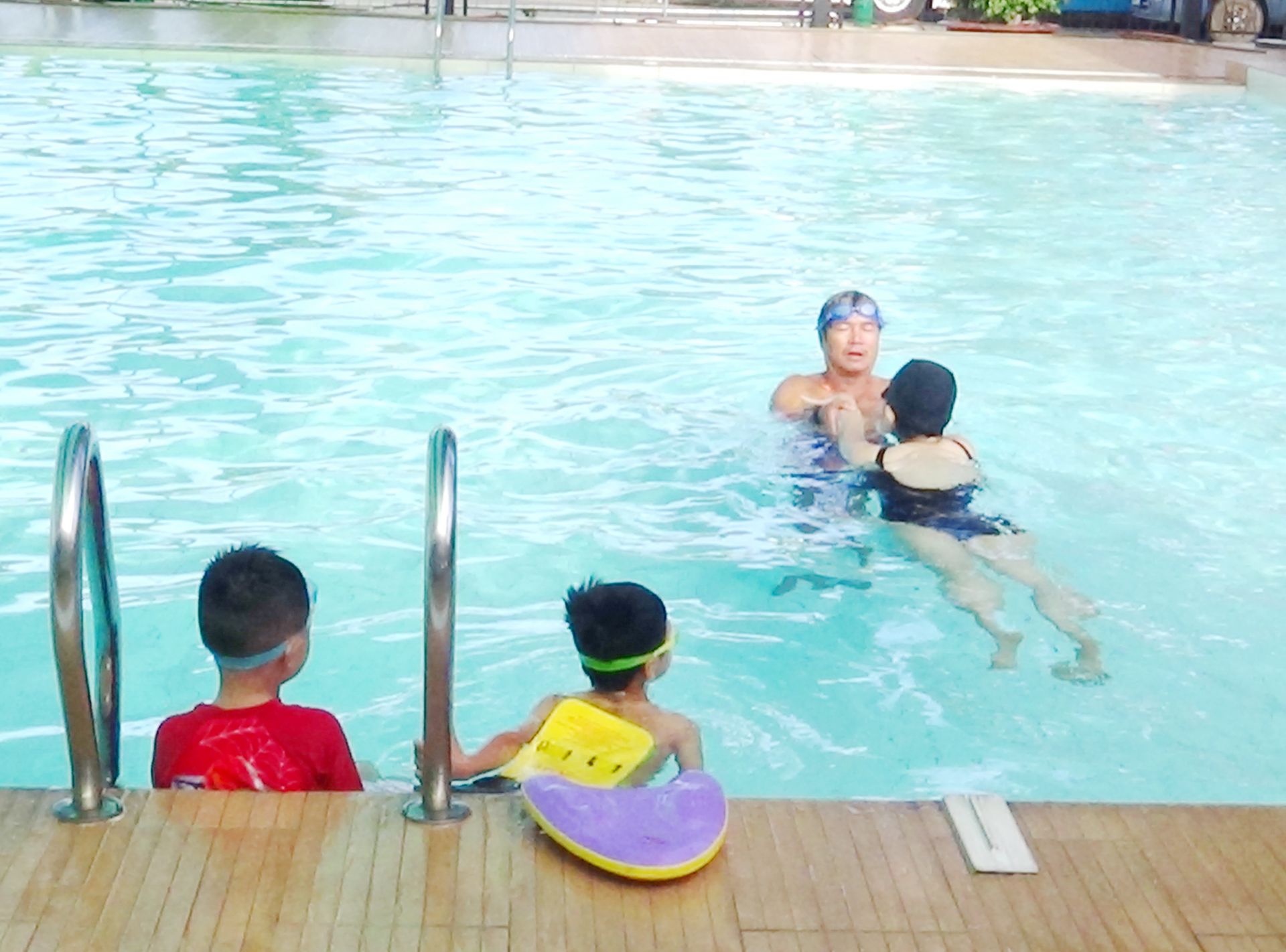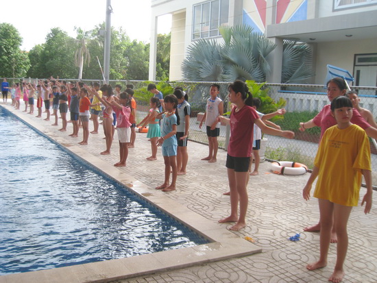 Các em nhỏ khởi động trước khi xuống hồ tập bơi.