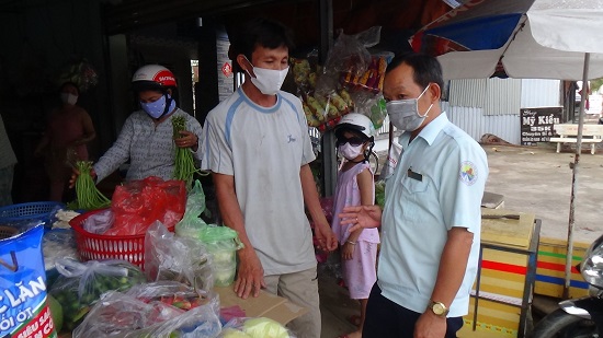 Thành viên Đoàn kiểm tra nhắc nhở 1 chủ cửa hàng tạp hóa chưa chấp hành tốt quy định về giãn cách xã hội.