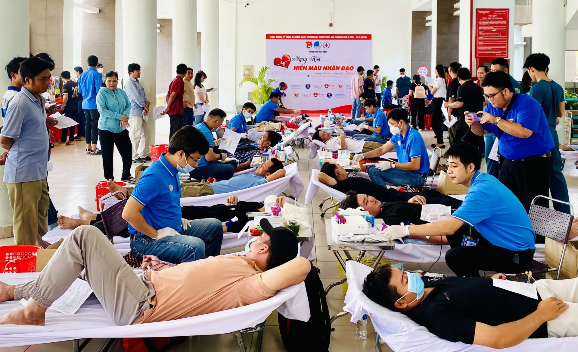 Đông đảo cán bộ, công chức, viên chức, người lao động, đoàn viên thanh niên, lực lượng vũ trang đến tham gia hiến máu tại ngày hội hiến máu nhân đạo nhân kỷ niệm 93 ngày thành lập Đoàn TNCS Hồ Chí Minh.