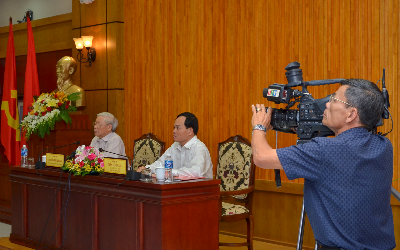 Cameramen Quốc Tuấn- Ðài PT-TH Tây Ninh tác nghiệp trong chuyến thăm và làm việc của Tổng Bí thư Nguyễn Phú Trọng tại tỉnh Tây Ninh ngày 5.6.2016. Ảnh: Ð.H.T