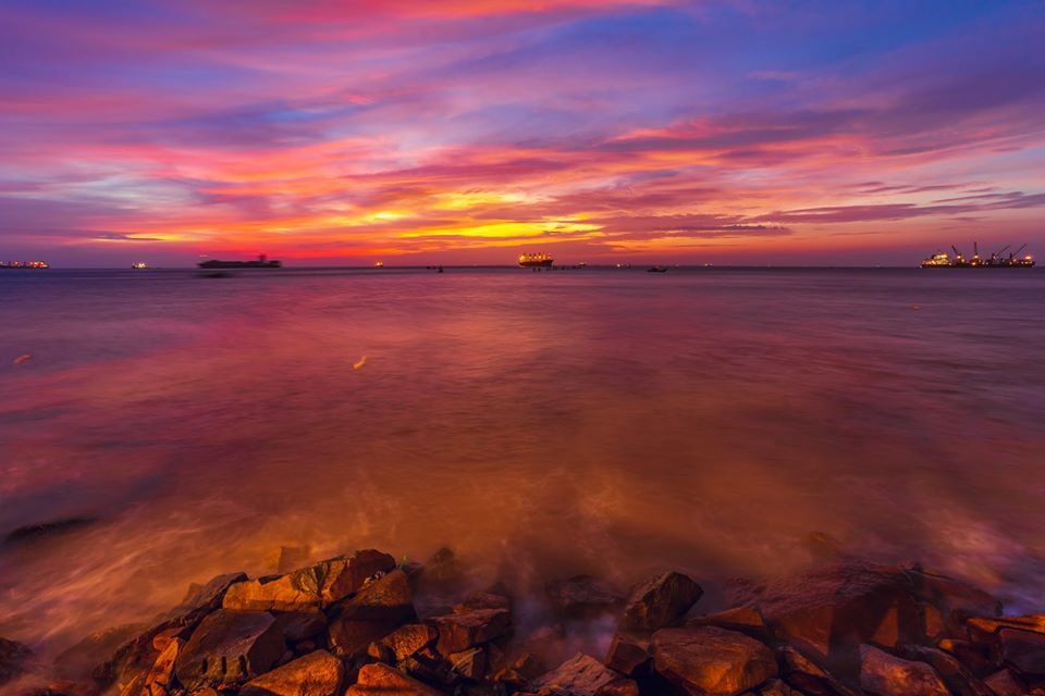 Bạn Trần Tuấn Anh chia sẻ: "Để săn ảnh hoàng hôn đẹp phụ thuộc rất nhiều yếu tố như thời tiết, góc chụp, địa điểm và một chút chỉnh màu nữa". Đừng chỉ chọn những ngày thời tiết đẹp, những bức ảnh ấn tượng thường được chụp khi mặt trời chiếu vào các đám mây, tạo ra hiệu ứng ánh sáng lạ mắt. Những ngày có khói, bụi trong không khí cũng là những ngày cho bạn những bức ảnh ấn tượng. Ảnh: Bạch Ánh Ngọc.
