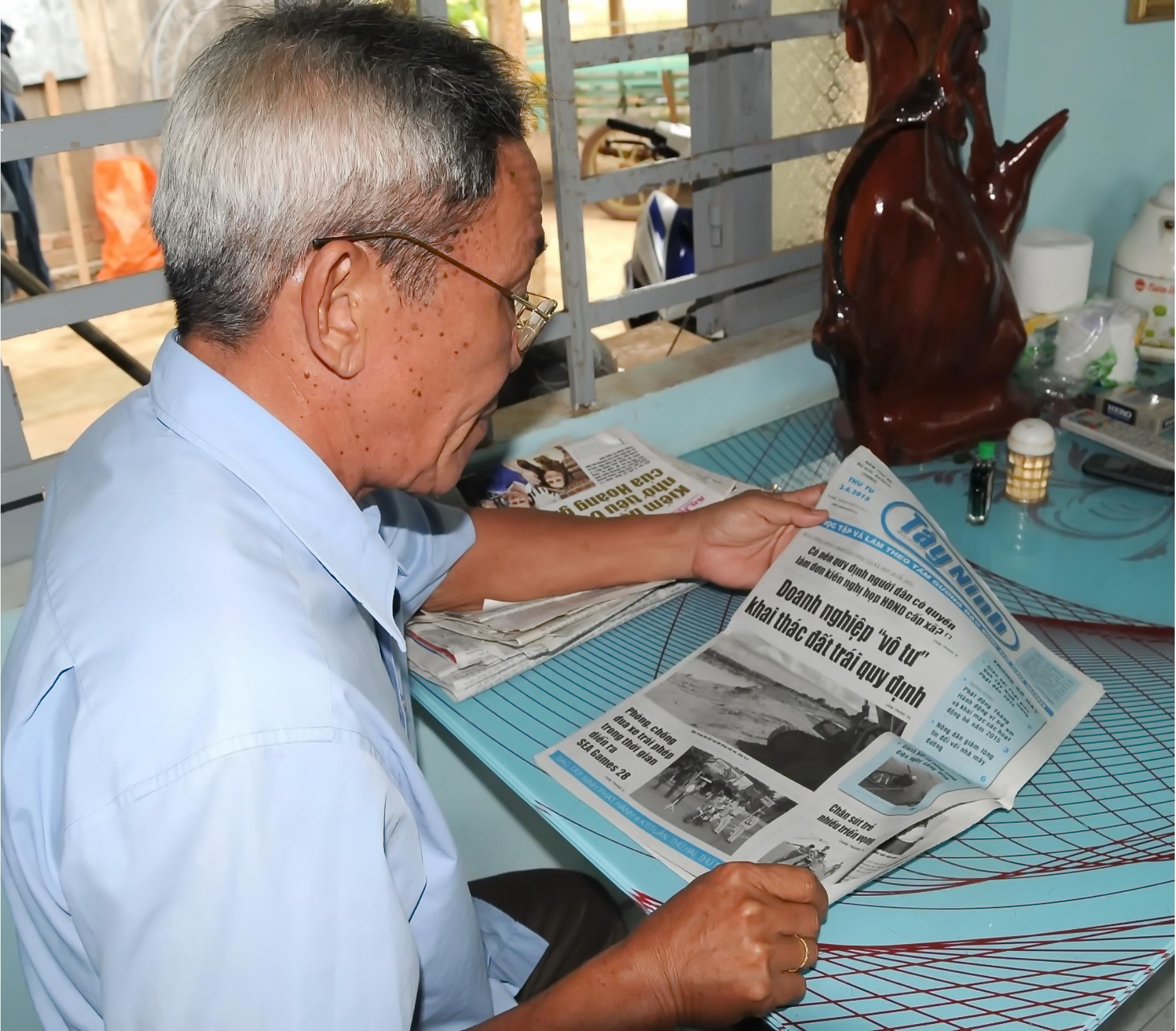 Ông Nguyễn Văn Tâm- Trưởng Ban quản lý ấp Tân Trung, xã Tân Hà, huyện Tân Châu chăm chú đọc Báo Tây Ninh vừa được phát hành.