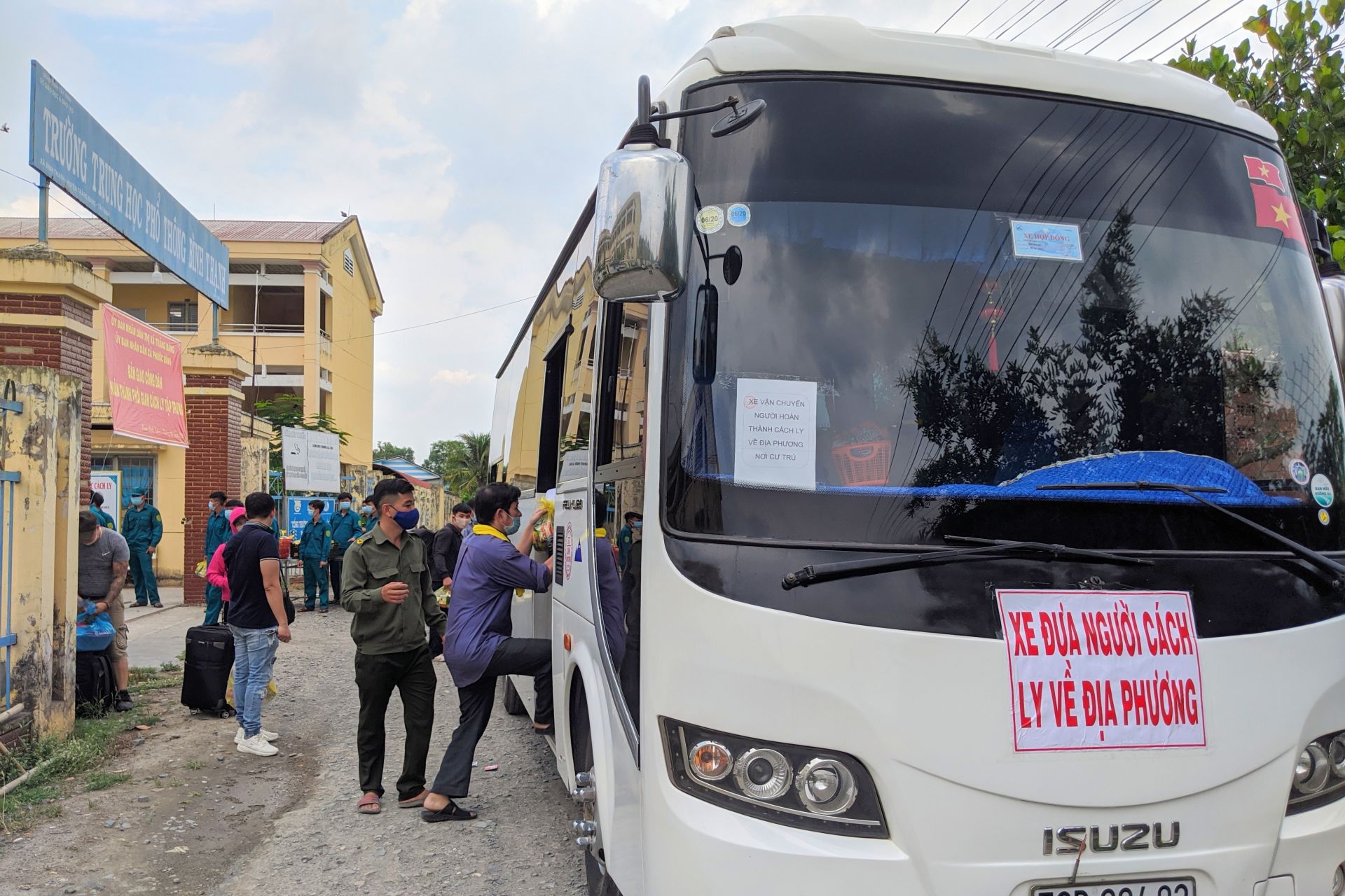 Các công dân hoàn thành thời gian cách ly tập trung lên xe về địa phương.