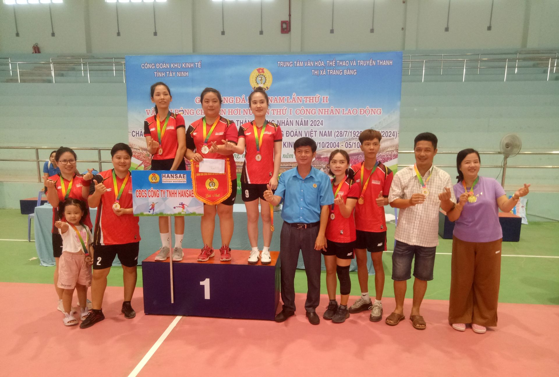 Ông Trần Lê Duy- Chủ tịch Liên đoàn lao động tỉnh (thứ 5, từ phải qua) trao giải nhất cho Đội bóng chuyền nữ Công đoàn cơ sở Công ty TNHH Hansae Tây Ninh.