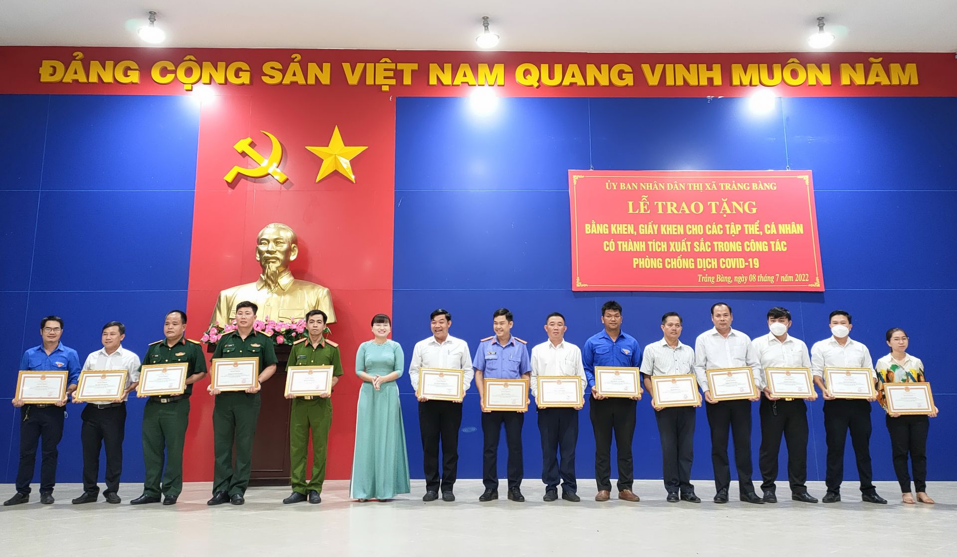 Chiều 8.7, UBND thị xã Trảng Bàng tổ chức lễ trao tặng bằng khen, giấy khen cho các tập thể, cá nhân có thành tích xuất sắc trong công tác phòng, chống dịch Covid-19.