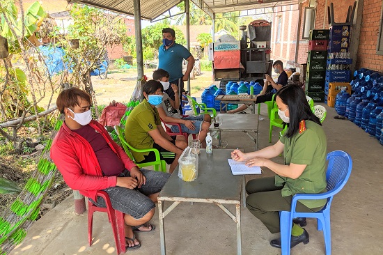Thành viên đoàn kiểm tra làm việc với các trường hợp tụ tập đông người và vi phạm không đeo khẩu trang tại xã Phước Chỉ, thị xã Trảng Bàng.