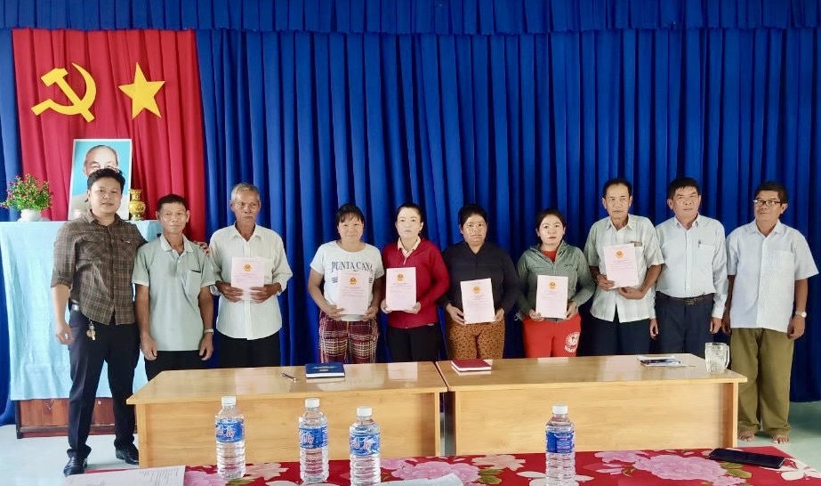 Lãnh đạo Đảng uỷ, UBND xã Phước Chỉ và chính quyền ấp trao giấy chứng nhận quyền sử dụng đất cho các hộ dân Cụm dân cư Phước Mỹ.