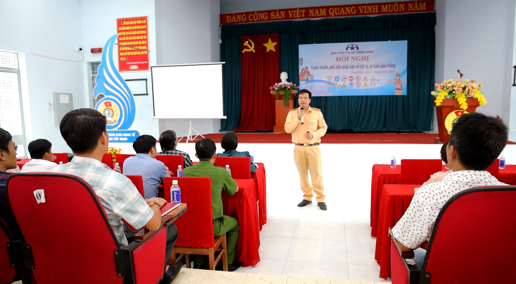 Ngày 23.5, Công an thị xã Trảng Bàng phối hợp Phòng Cảnh sát Giao thông Công an tỉnh tổ chức hội nghị tuyên truyền, phổ biến pháp luật về trật tự an toàn giao thông đến doanh nghiệp, người lao động trong các khu công nghiệp và khu chế xuất.