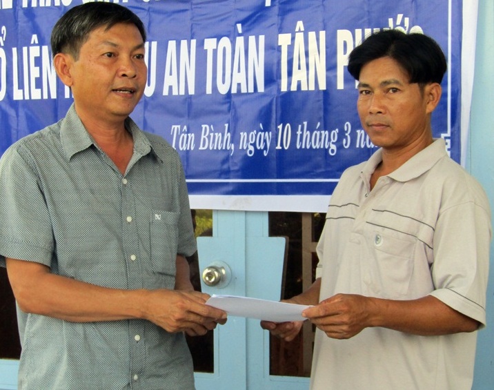 Ông Trần Bạch Phát- Trưởng Trạm Trồng trọt và Bảo vệ thực vật Thành phố Tây Ninh (trái) trao quyết định chứng nhận sản phẩm phù hợp quy trình VietGAP cho đại diện Tổ liên kết rau an toàn Tân Phước. |