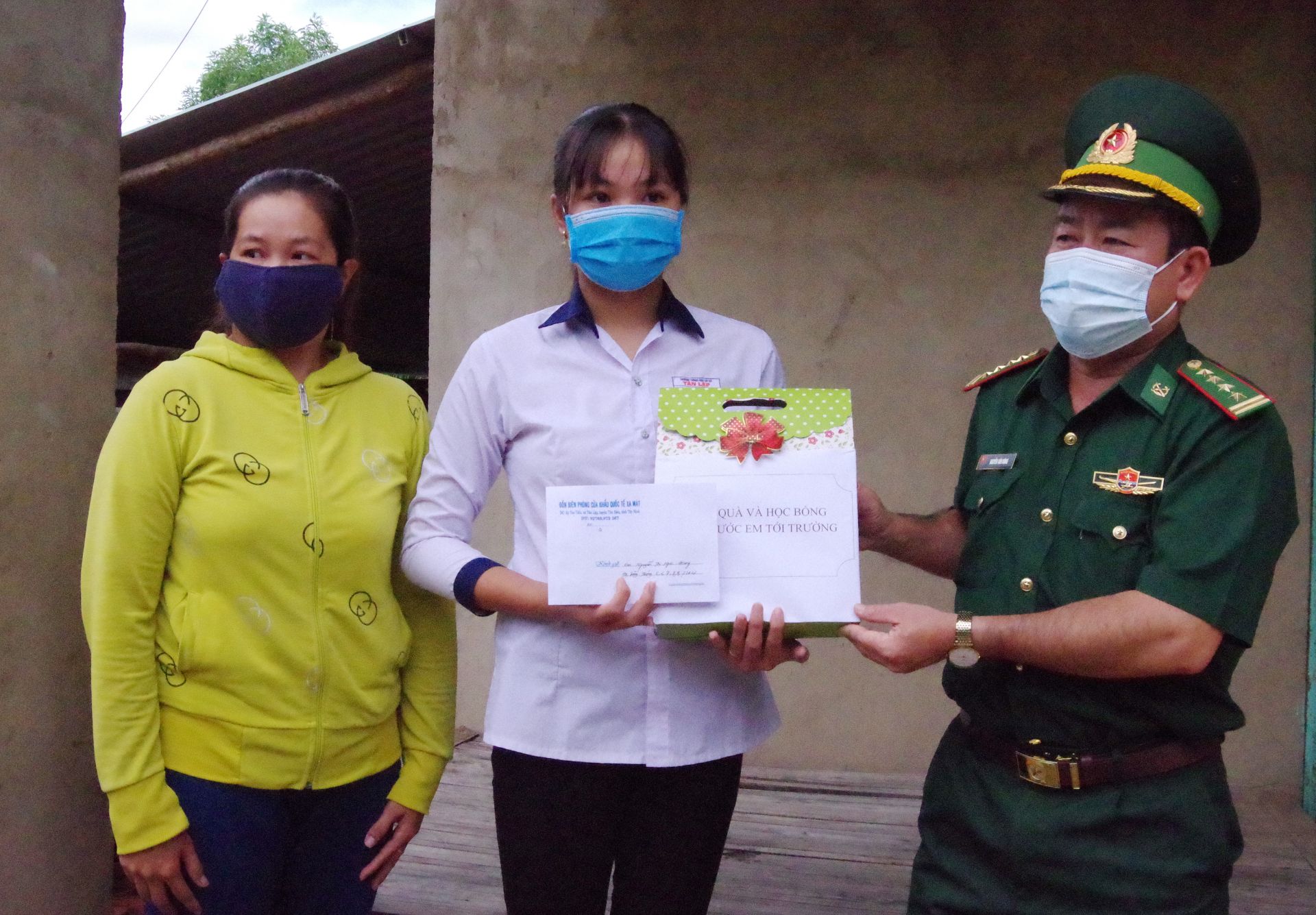 Đại tá Nguyễn Văn Dũng- Phó Chính uỷ BĐBP tỉnh tặng học bổng và dụng cụ học tập cho em Nguyễn Thị Ngọc Giang, chuẩn bị vào lớp 9 Trường THCS Tân Lập. (Em Giang do Đại tá Nguyễn Văn Dũng trực tiếp nhận đỡ đầu).