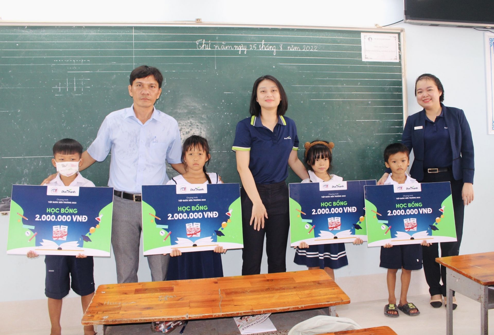 Mỗi suất học bổng trị giá 2 triệu đồng và 10kg gạo, do Công ty TNHH Đức Thành hỗ trợ, nhằm tiếp sức đến trường cho các em học sinh nghèo hiếu học trên địa bàn tỉnh.