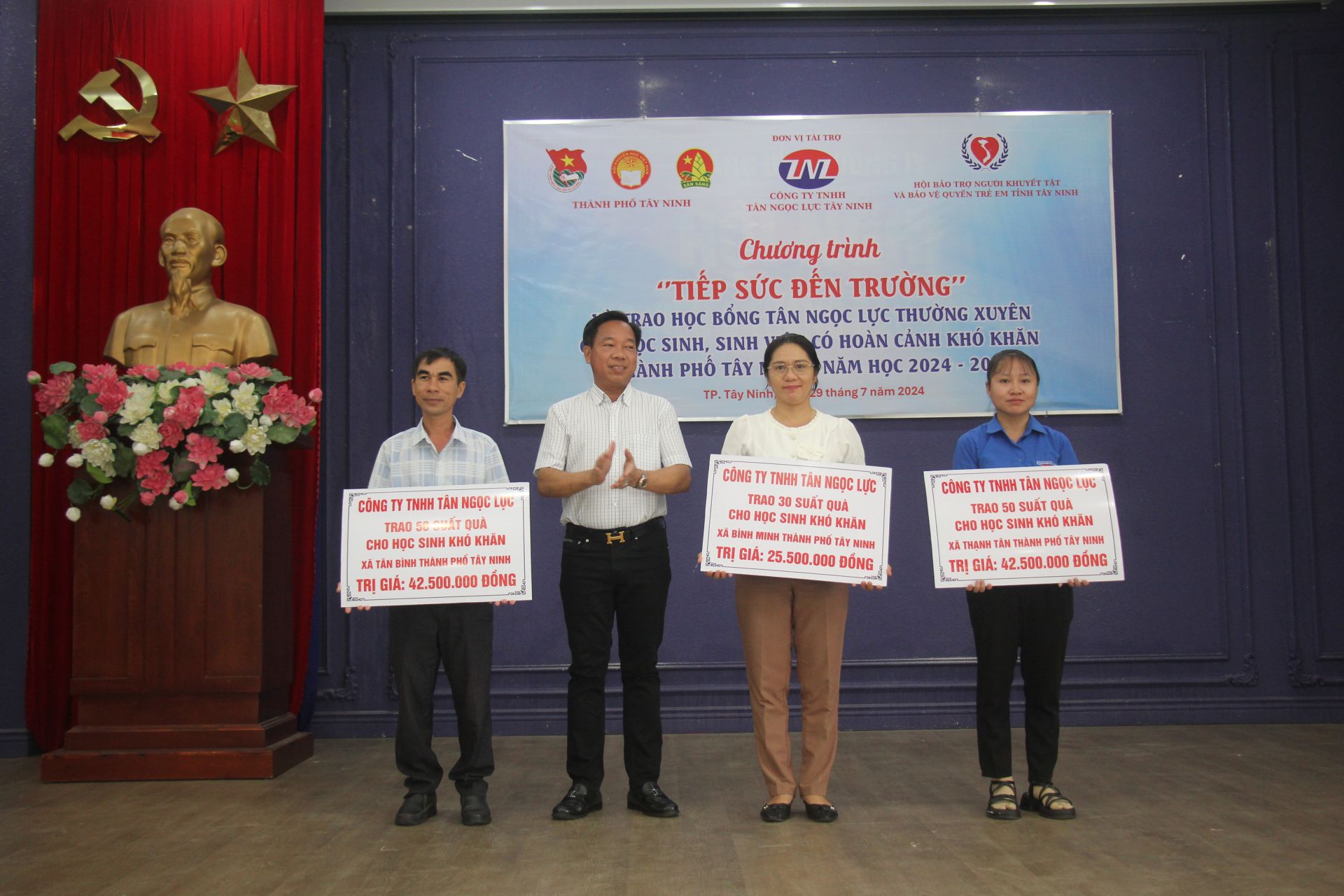 Tại buổi lễ, Công ty TNHH Tân Ngọc Lực trao bảng tượng trưng tài trợ học bổng thường xuyên cho 20 em học sinh, sinh viên có hoàn cảnh khó khăn, học giỏi, trị giá 80 triệu đồng; trao tặng 15 xe đạp cho học sinh nghèo; tặng 400 suất quà gồm ba lô học sinh và tập, sách cho các em học sinh vượt khó học giỏi. Tổng trị giá học bổng và quà tặng là 420 triệu đồng.