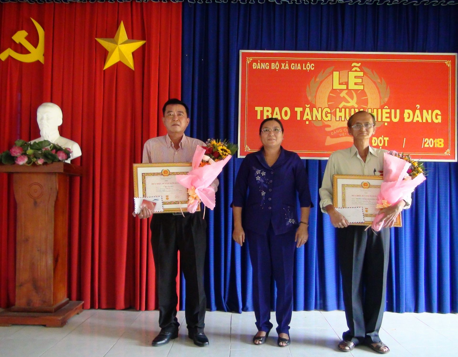 Trong đó, Huy hiệu 40 năm tuổi Đảng trao cho đảng viên Trương Văn Thành (sinh năm 1955, sinh hoạt tại chi bộ ấp Gia Lâm); Huy hiệu 30 năm tuổi Đảng được trao cho đảng viên Hồ Văn Thức (sinh năm 1962, hiện sinh hoạt Đảng tại chi bộ ấp Gia Tân).