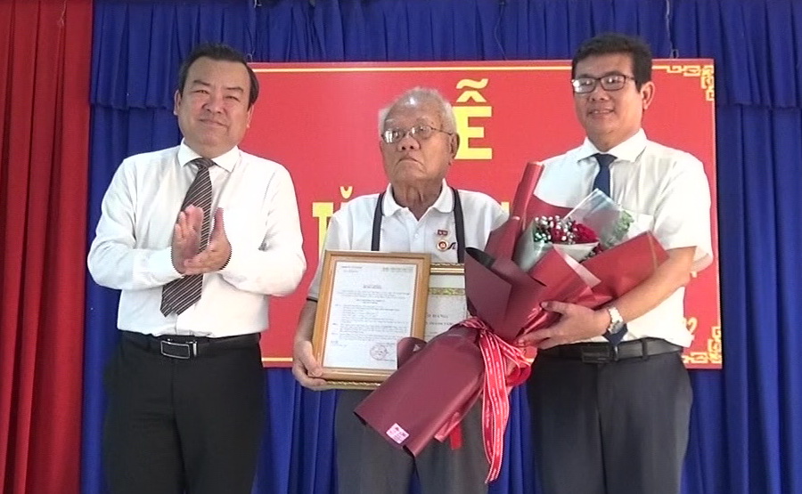 Đồng chí Phạm Hùng Thái – Phó Bí thư Thường trực Tỉnh uỷ, Trưởng đoàn Đại biểu Quốc hội đơn vị tỉnh Tây Ninh (trái) trao Huy hiệu 60 tuổi Đảng cho đảng viên Trương Văn Xê (Nguyễn Thành Tâm) tại phường An Hoà.