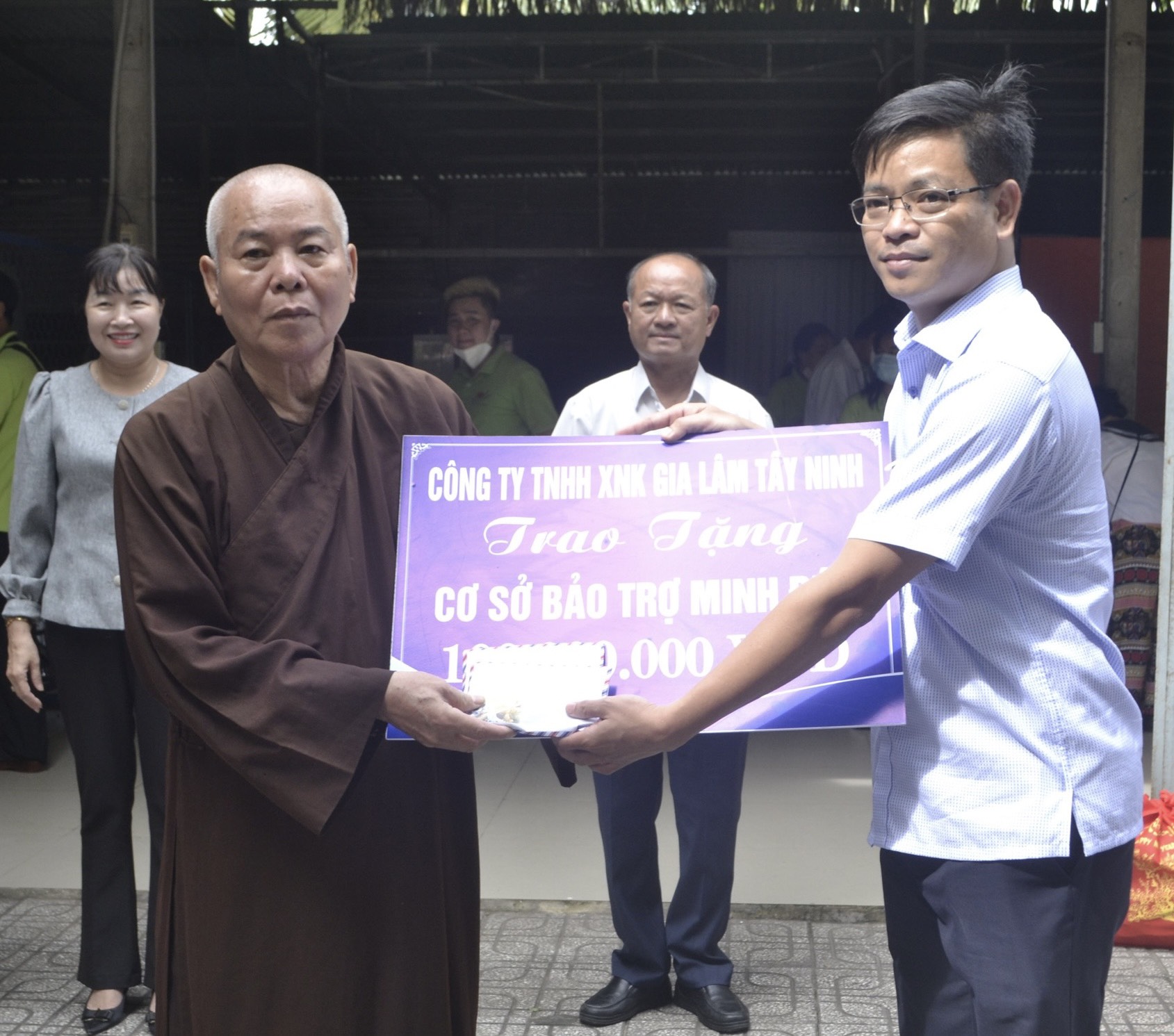 Ông Nguyễn Văn Liêu– Giám đốc Công ty TNHH XNK Gia Lâm Tây Ninh trao số tiền hỗ trợ cho Thượng tọa Thích Định Tánh– Trụ trì chùa Cẩm Phong, Giám đốc Cơ sở bảo trợ Minh Đức.
