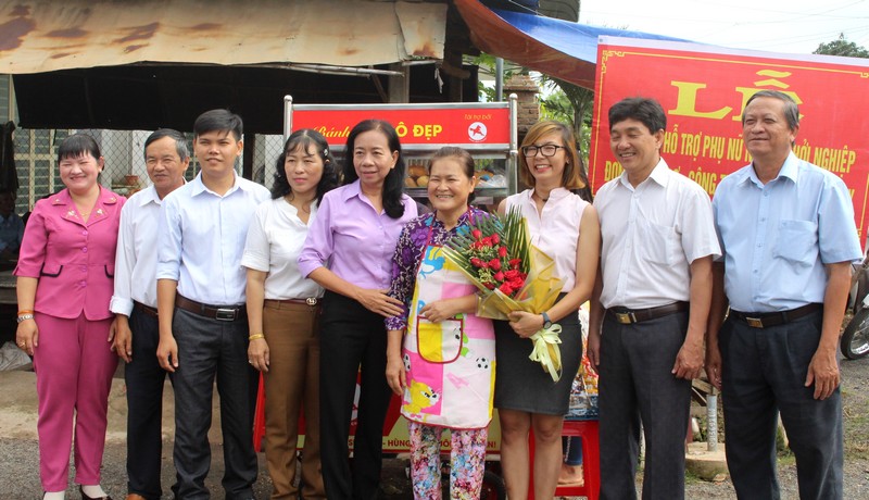 Lãnh đạo địa phương và đơn vị tài trợ trao xe bánh mì cho bà Huỳnh Thị Đẹp. |