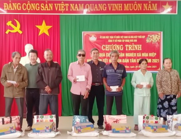 Mỗi phần quà trị giá 500.000 đồng, tổng số tiền là 60.000.000 đồng, do Công ty cổ phần tập đoàn Khải Anh (xã Hòa Hiệp) tài trợ, nhằm giúp đỡ, hỗ trợ các gia đình có hoàn cảnh khó khăn, hộ nghèo và người già neo đơn có điều kiện vui xuân đón Tết.