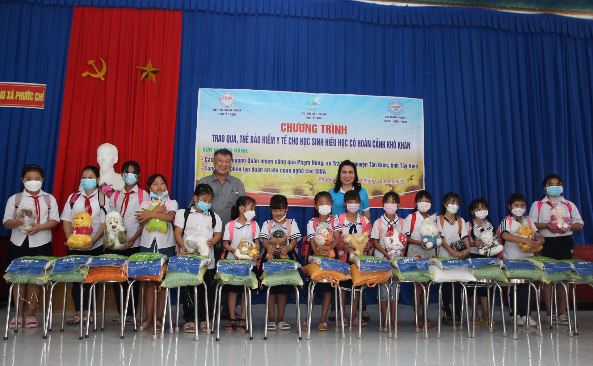 Chào mừng Ngày Doanh nhân Việt Nam 13.10 và ngày thành lập Hội Liên hiệp Phụ nữ Việt Nam 20.10, Hội Liên hiệp Phụ nữ tỉnh phối hợp Hiệp hội Doanh nghiệp tỉnh tổ chức chương trình trao quà, thẻ bảo hiểm y tế cho học sinh hiếu học có hoàn cảnh khó khăn trên địa bàn các xã Phước Bình và Phước Chỉ, thị xã Trảng Bàng.