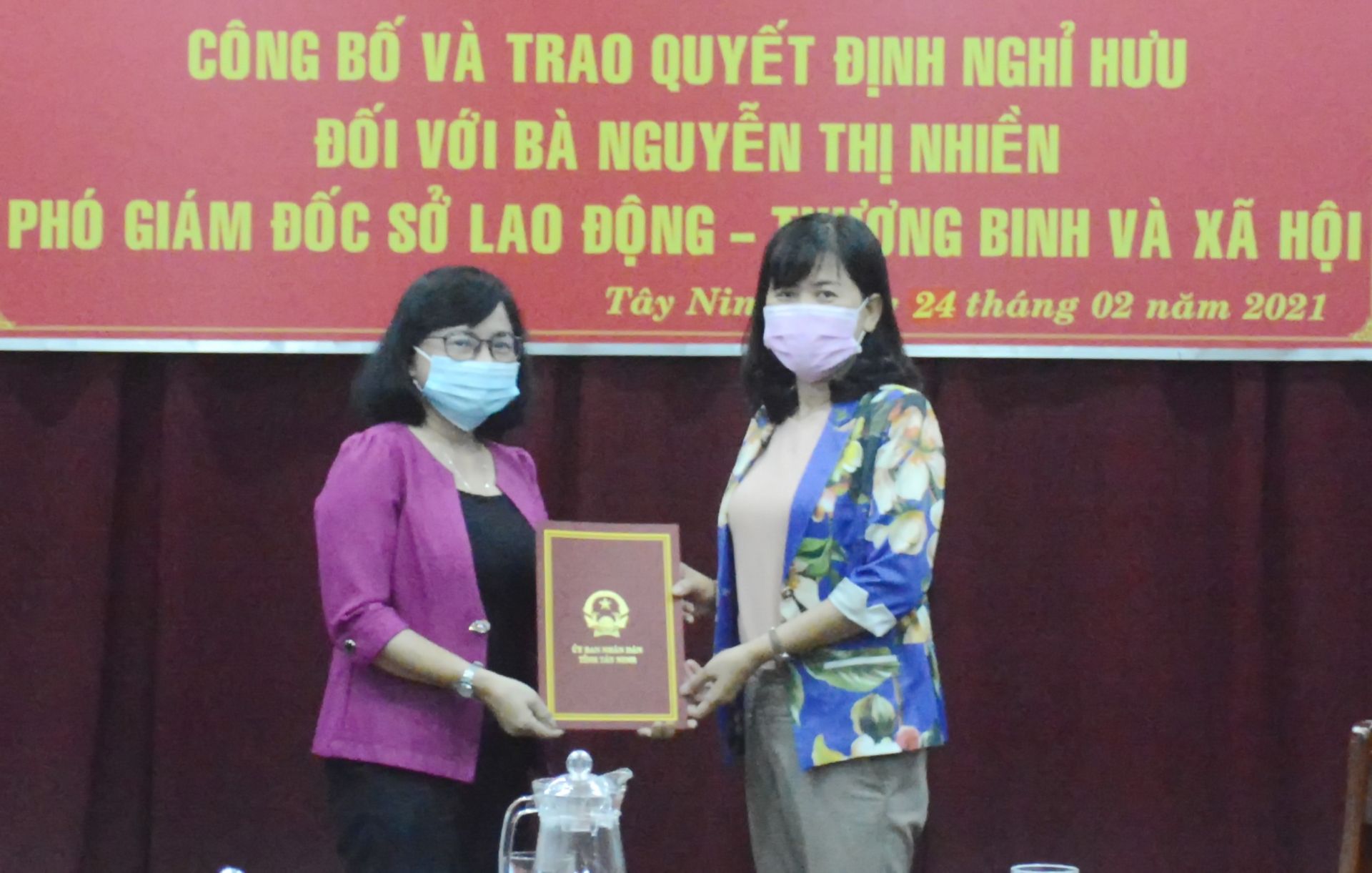 Chiều 24.2, bà Nguyễn Đài Thy- Giám đốc Sở Nội vụ công bố quyết định nghỉ hưu đối với bà Nguyễn Thị Nhiền- Phó giám đốc Sở Lao động Thương binh và Xã hội.