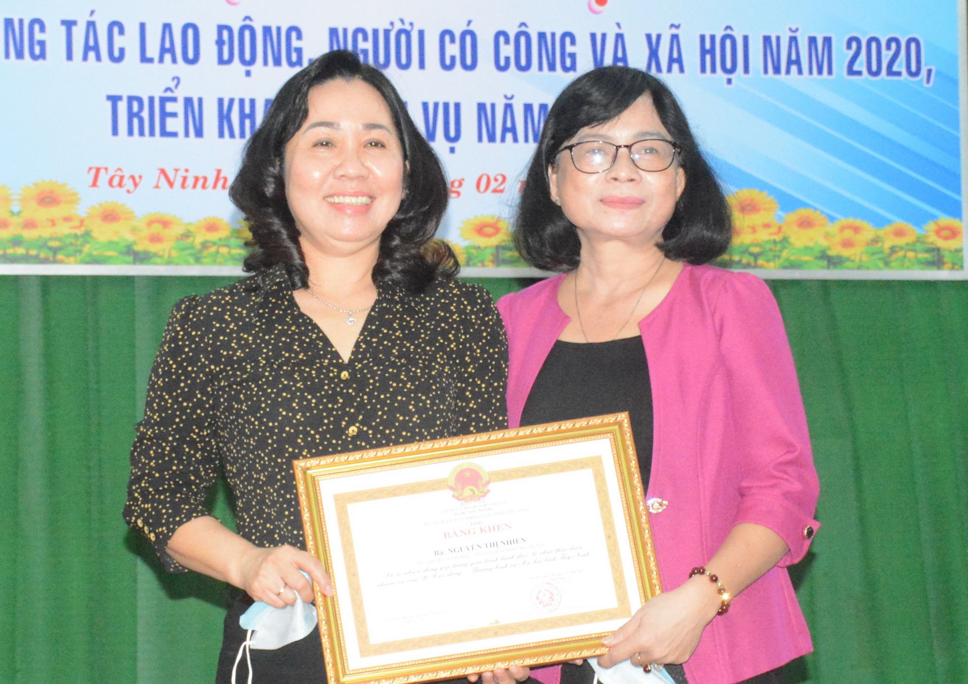 Bà Võ Thanh Thuỷ, Giám đốc Sở Lao động - Thương binh và Xã hội trao bằng khen của UBND tỉnh cho bà Nguyễn Thị Nhiền