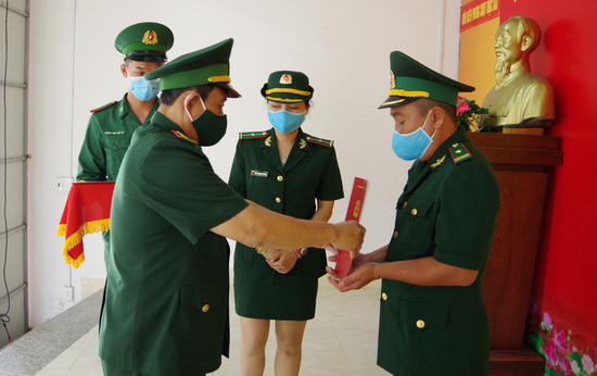 Đại tá Lê Hồng Vương - Chỉ huy trưởng BĐBP tỉnh Tây Ninh trao Quyết định của Bộ Tư lệnh BĐBP về việc thăng quân hàm cho 02 sĩ quan thuộc BĐBP tỉnh Bình Thuận đang tăng cường chống dịch tại Đồn BPCKQT Mộc Bài.