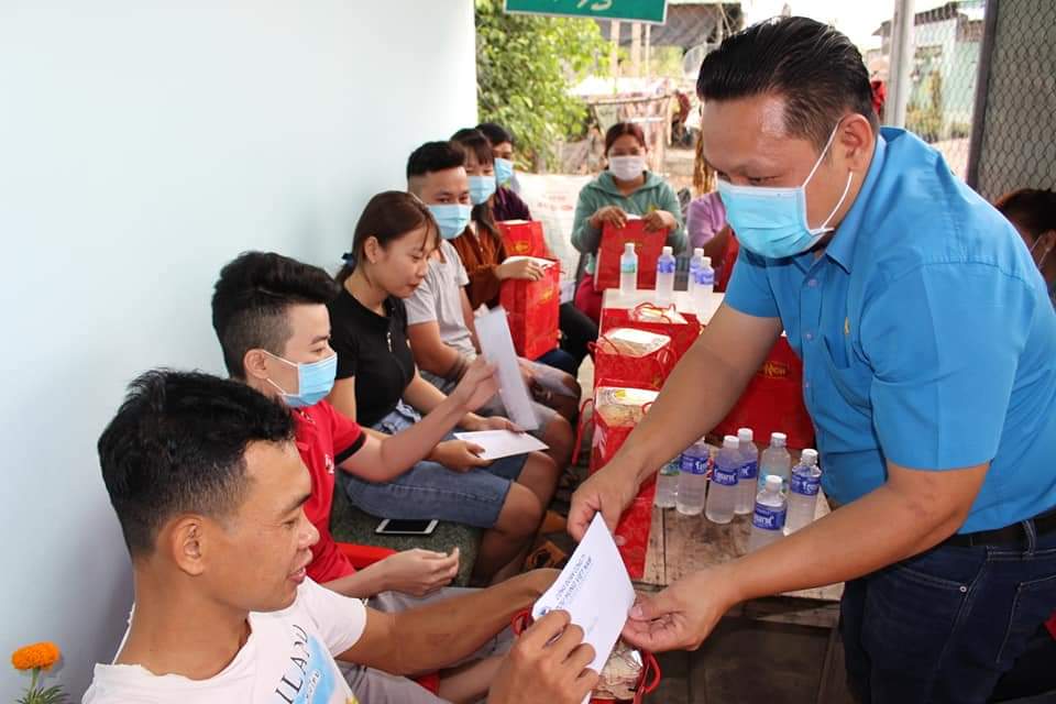 Đồng chí Nguyễn Hữu Cần – Chủ tịch CĐCS Công ty TNHH Pou Hung VN tặng quà cho các bạn CNLĐ khu nhà trọ không về quê đón tết.