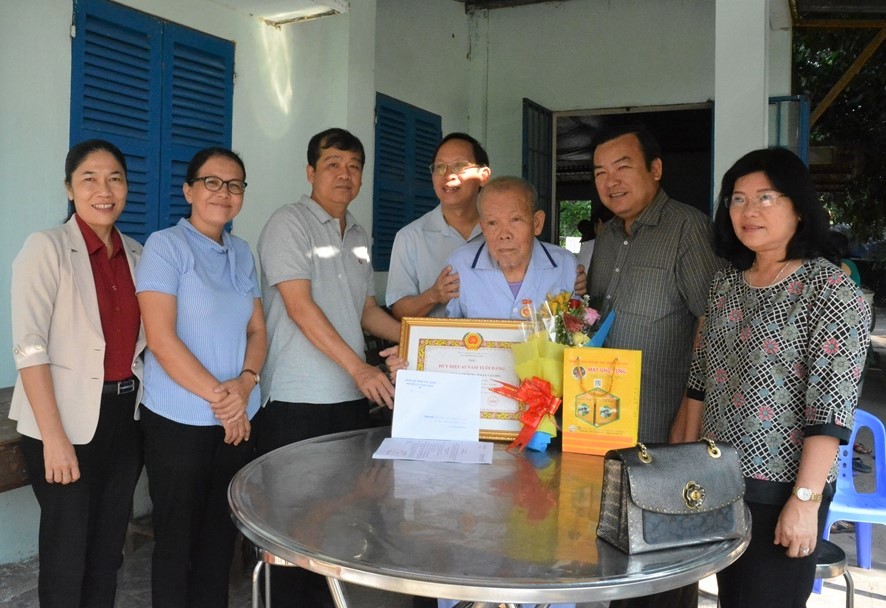 Huy hiệu 65 năm tuổi Đảng được trao cho đảng viên Trần Văn Dùng, sinh năm 1933, vào đảng chính thức ngày 17.5.1956, quê quán xã Tân Phước, huyện Gò Công Đông, tỉnh Tiền Giang, hiện sinh hoạt Đảng tại Chi bộ ấp Tân Thanh