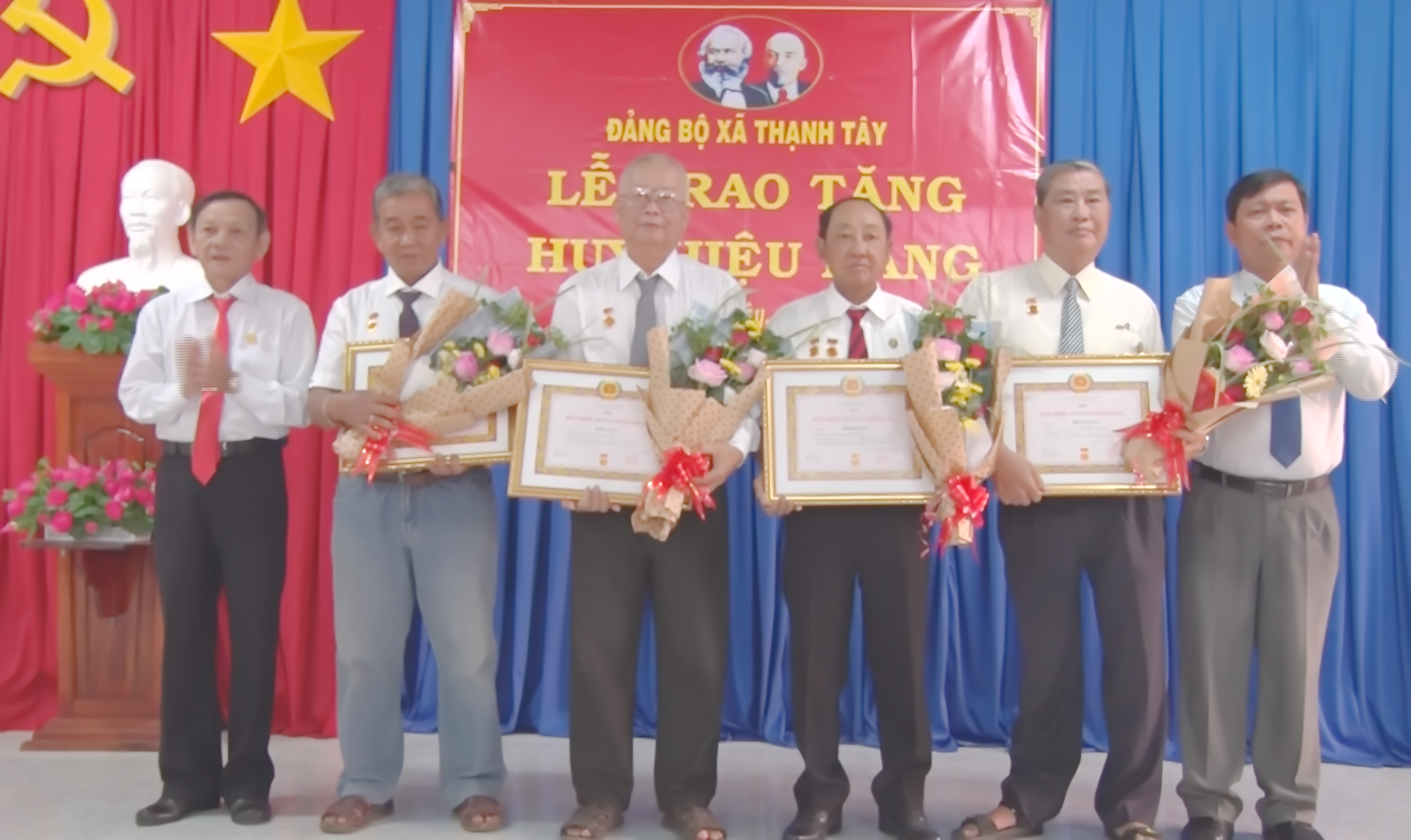 Huy hiệu 30 năm tuổi Đảng được trao cho 5 đảng viên: Phạm Việt Tài, Dương Văn Hụa, Nguyễn Thị Loan, Trần Hữu Đông và Nguyễn Bá Thủy.