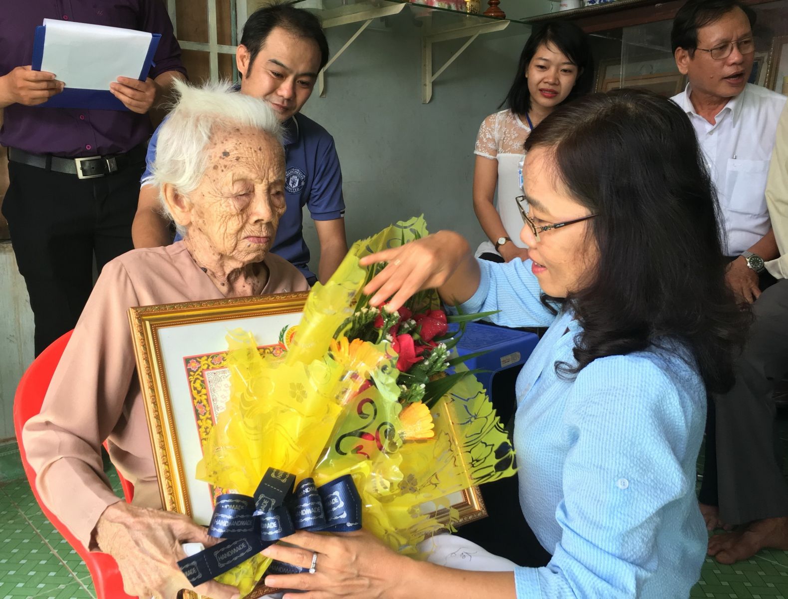 * Chiều cùng ngày, bà Nguyễn Thị Yến Mai- Bí thư Huyện ủy Châu Thành đã đến nhà riêng trao huy hiệu 45 năm tuổi Đảng cho Mẹ VNAH Lê Thị Sum, sinh năm 1929.