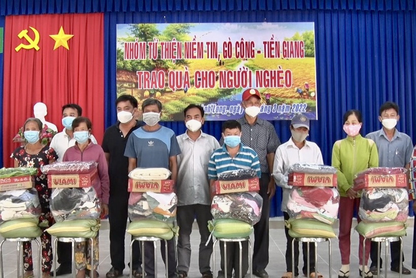 Mỗi phần quà trị giá 300 ngàn đồng gồm: 10 kg gạo, 1 thùng mì gói và các nhu yếu phẩm khác, trị giá 60 triệu đồng do Nhóm từ thiện Niềm Tin, Gò Công, Tiền Giang tài trợ.