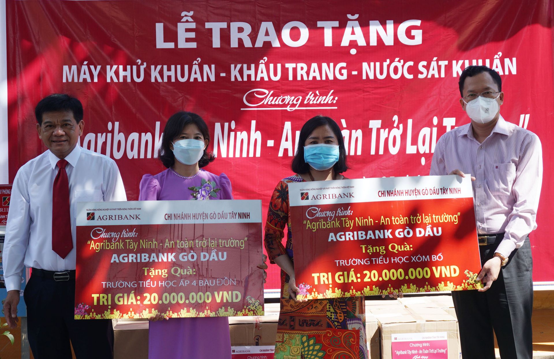 Tại đây, Agribank Tây Ninh phối hợp chi nhánh huyện Gò Dầu trao tặng 4 máy khử khuẩn tự động, 780 hộp khẩu trang và 80 lít dung dịch sát khuẩn, với tổng trị giá 40 triệu đồng cho Trường tiểu học Xóm Bố và Trường Tiểu học ấp 4 Bàu Đồn.