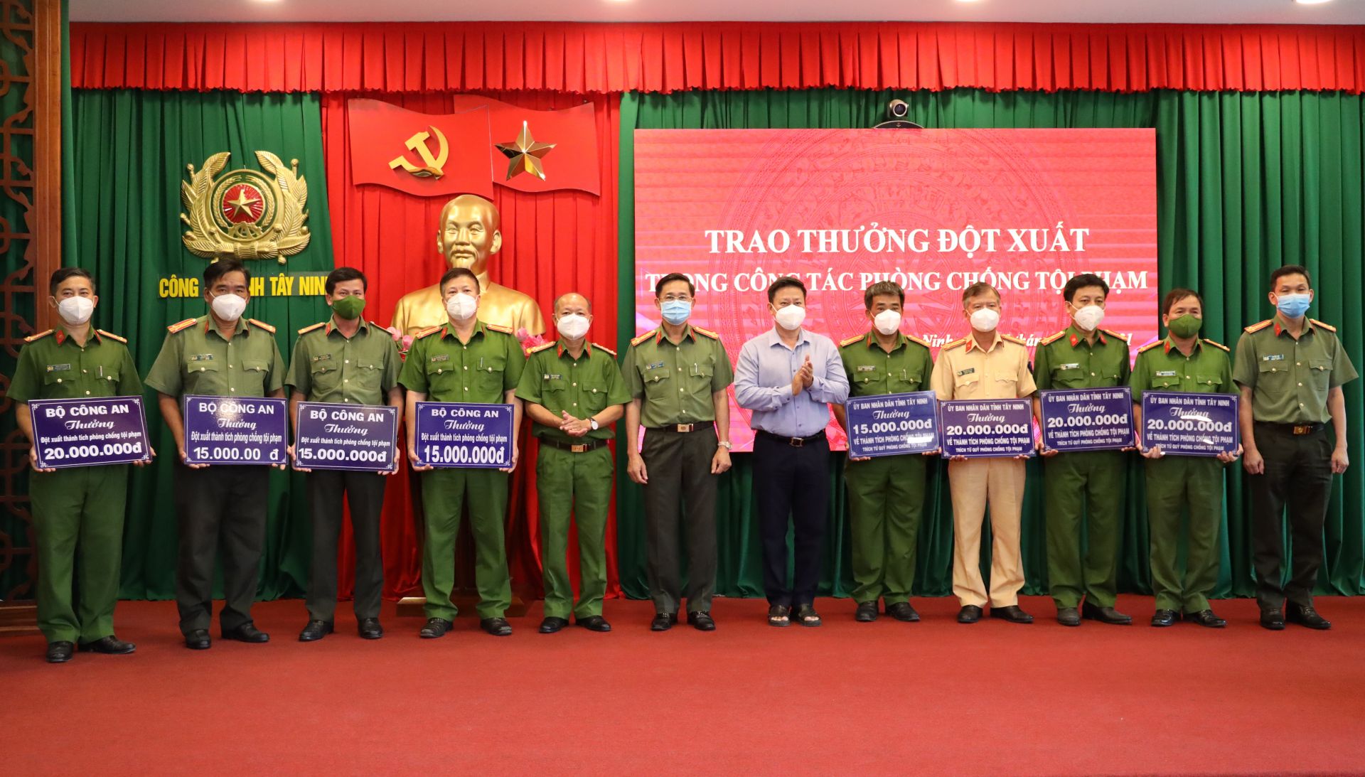 Tại buổi trao thưởng, Ban Giám đốc Công an tỉnh đã trao các quyết định của Bộ Công an, UBND tỉnh thưởng số tiền từ 15 đến 20 triệu đồng cho mỗi lượt tập thể, gồm: Phòng Cảnh sát môi trường, Phòng Cảnh sát giao thông, Phòng Cảnh sát điều tra tội phạm về ma tuý, Phòng Cảnh sát hình sự, Phòng Cảnh sát cơ động, Phòng Kỹ thuật nghiệp vụ Công an tỉnh, Phòng Hồ sơ, Phòng Kỹ thuật hình sự, Phòng Tham mưu Công an tỉnh, Công an thành phố Tây Ninh, Công an thị xã Trảng Bàng, Công an huyện Bến Cầu.