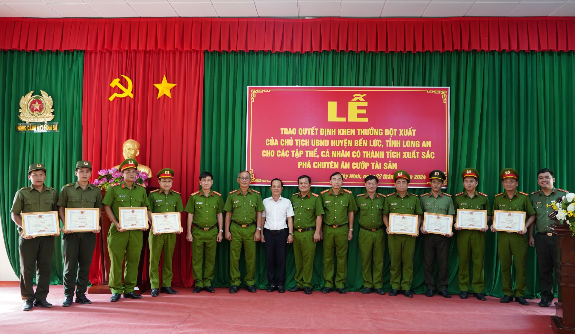 Chiều 22.4, tại Hội trường Phòng Cảnh sát hình sự Công an Tây Ninh, UBND huyện Bến Lức (tỉnh Long An) tổ chức lễ trao quyết định khen thưởng đột xuất của Chủ tịch UBND huyện Bến Lức cho các tập thể, cá nhân có thành tích xuất sắc phá chuyên án cướp tài sản xảy ra trên địa bàn huyện Bến Lức, tỉnh Long An.