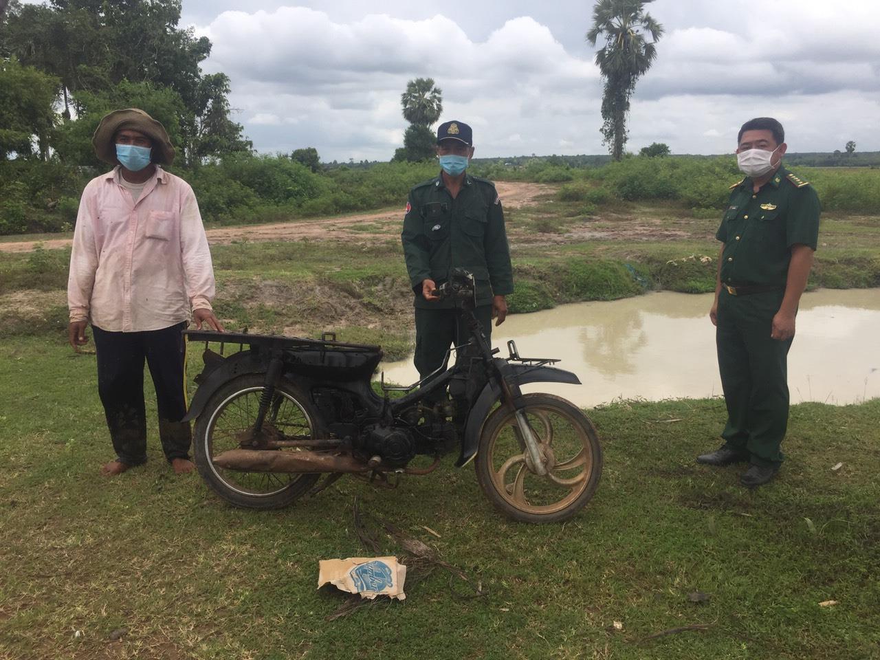 Đại diện Đồn Biên phòng Tân Hà tiếp nhận chiếc xe gắn máy từ lực lượng bảo vệ biên giới xã Ruong (Campuchia) và trả cho ông Trần Văn Tuấn (áo trắng)