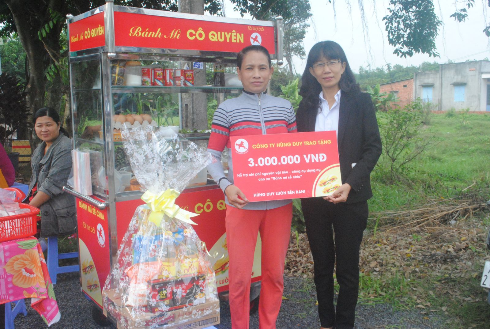 Tại buổi lễ, chị Quyên được nhận hỗ trợ một xe bán bánh mì trị giá 5 triệu đồng, 3 triệu tiền mặt hỗ trợ kinh doanh và một phần quà, do Công ty Hùng Duy tài trợ.