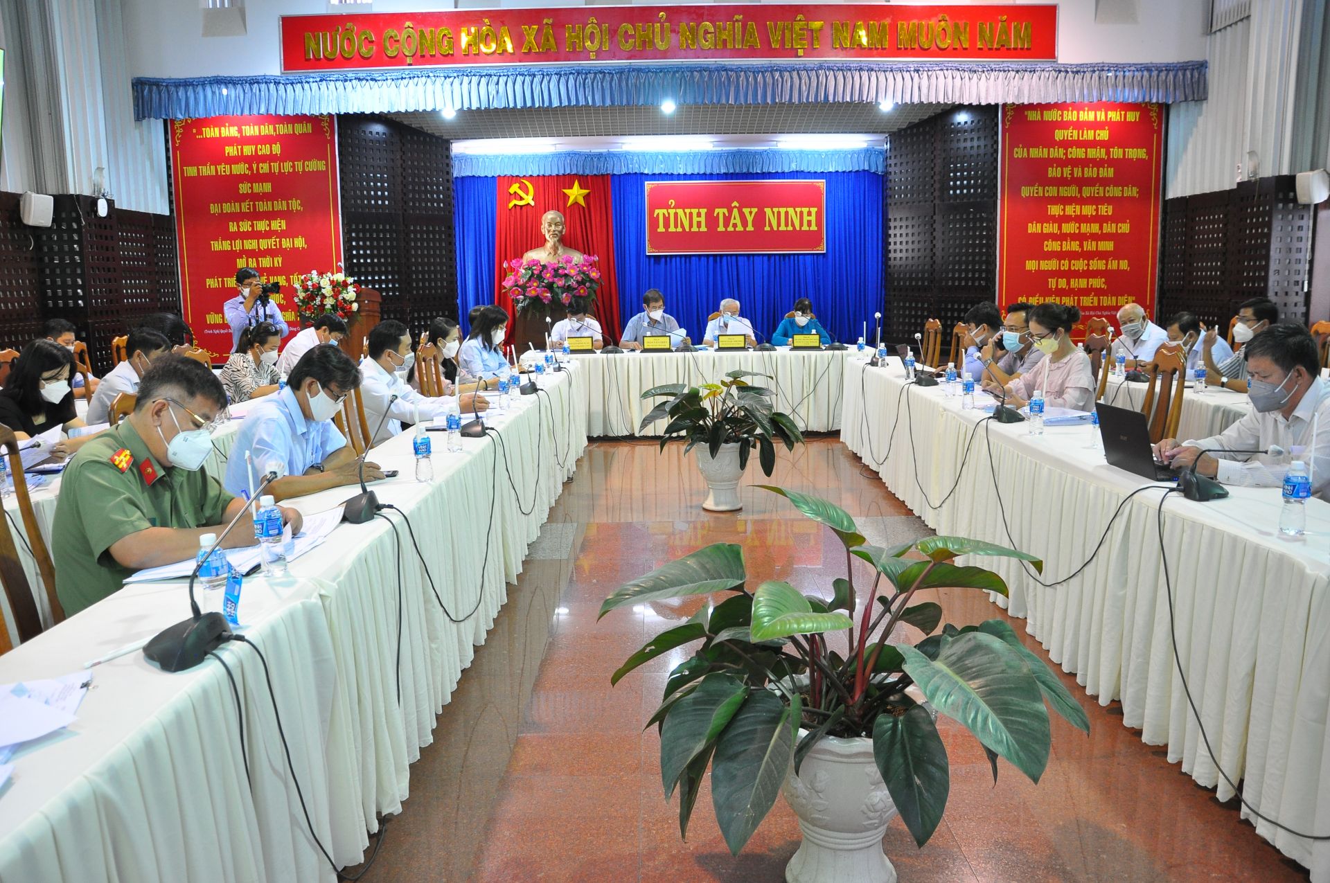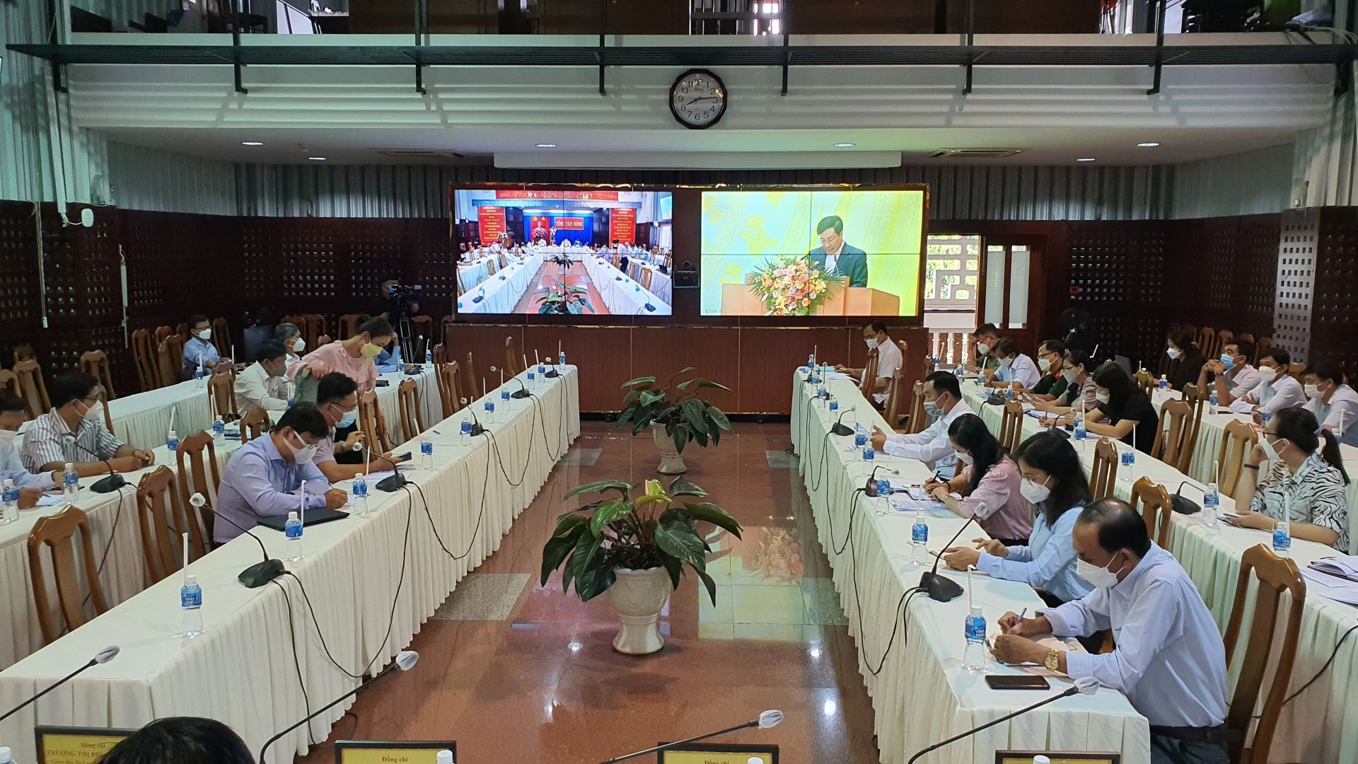 Phó Chủ tịch UBND tỉnh Trần Văn Chiến cùng lãnh đạo các sở, ban ngành tỉnh tham dự hội nghị tại điểm cầu Tây Ninh.