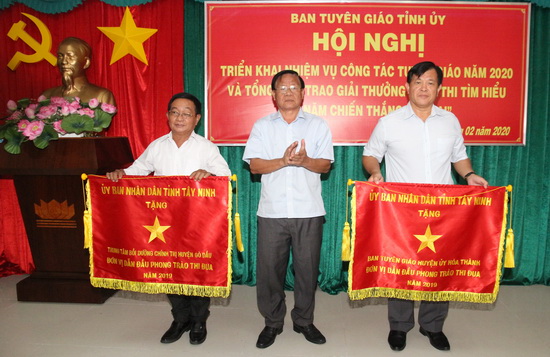 Ban Tuyên giáo Huyện uỷ Hoà Thành và Trung tâm Bồi dưỡng Chính trị huyện Gò Dầu nhận cờ Đơn vị dẫn đầu phong trào thi đua năm 2019