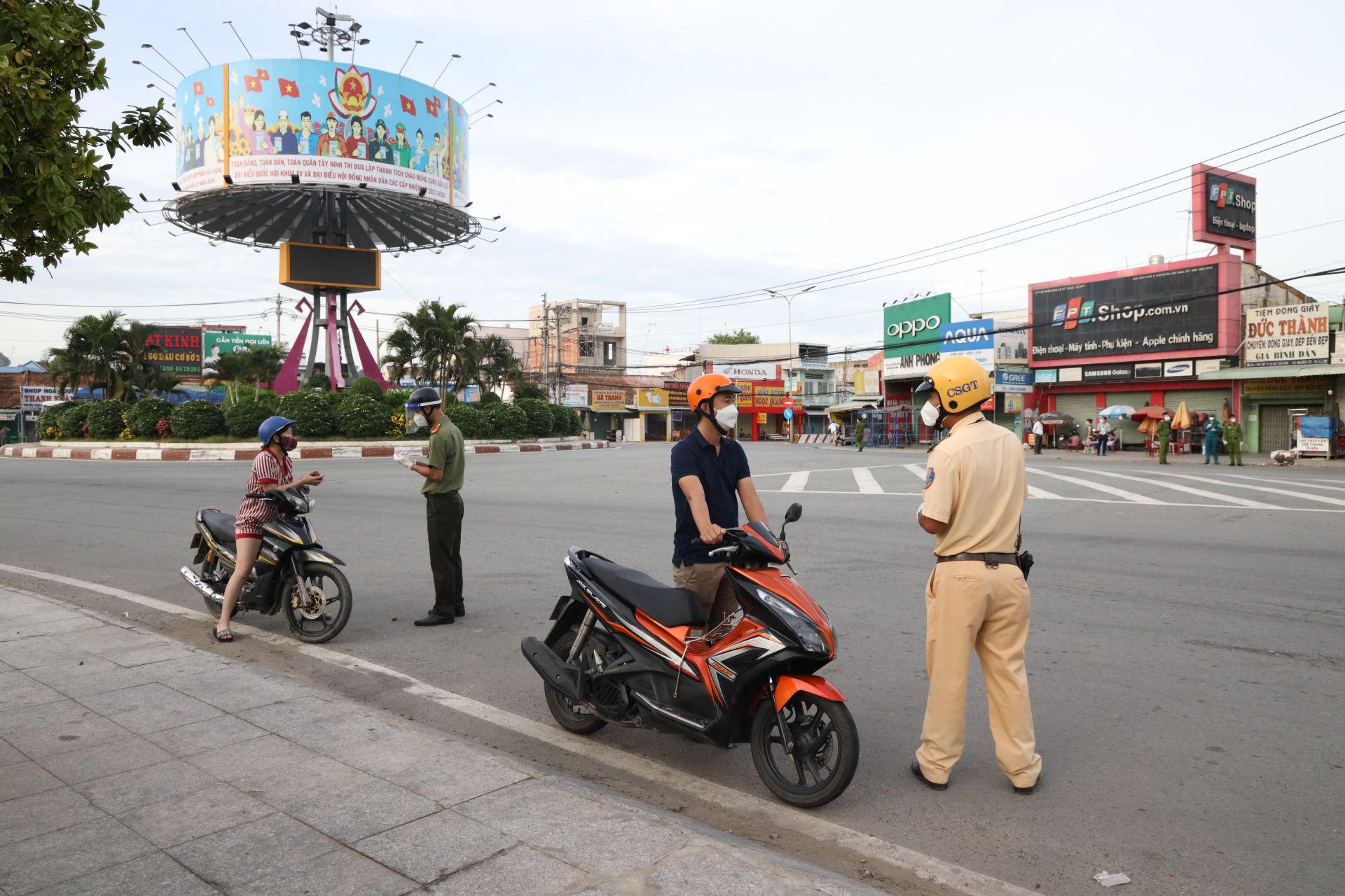 Lực lượng chức năng huyện Gò Dầu kiểm tra việc chấp hành quy định về giãn cách xã hội theo Chỉ thị 16/CT-TTg của Thủ tướng Chính phủ. Ảnh: Minh Nhật