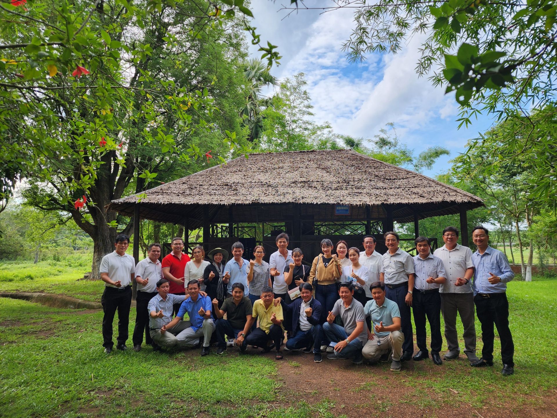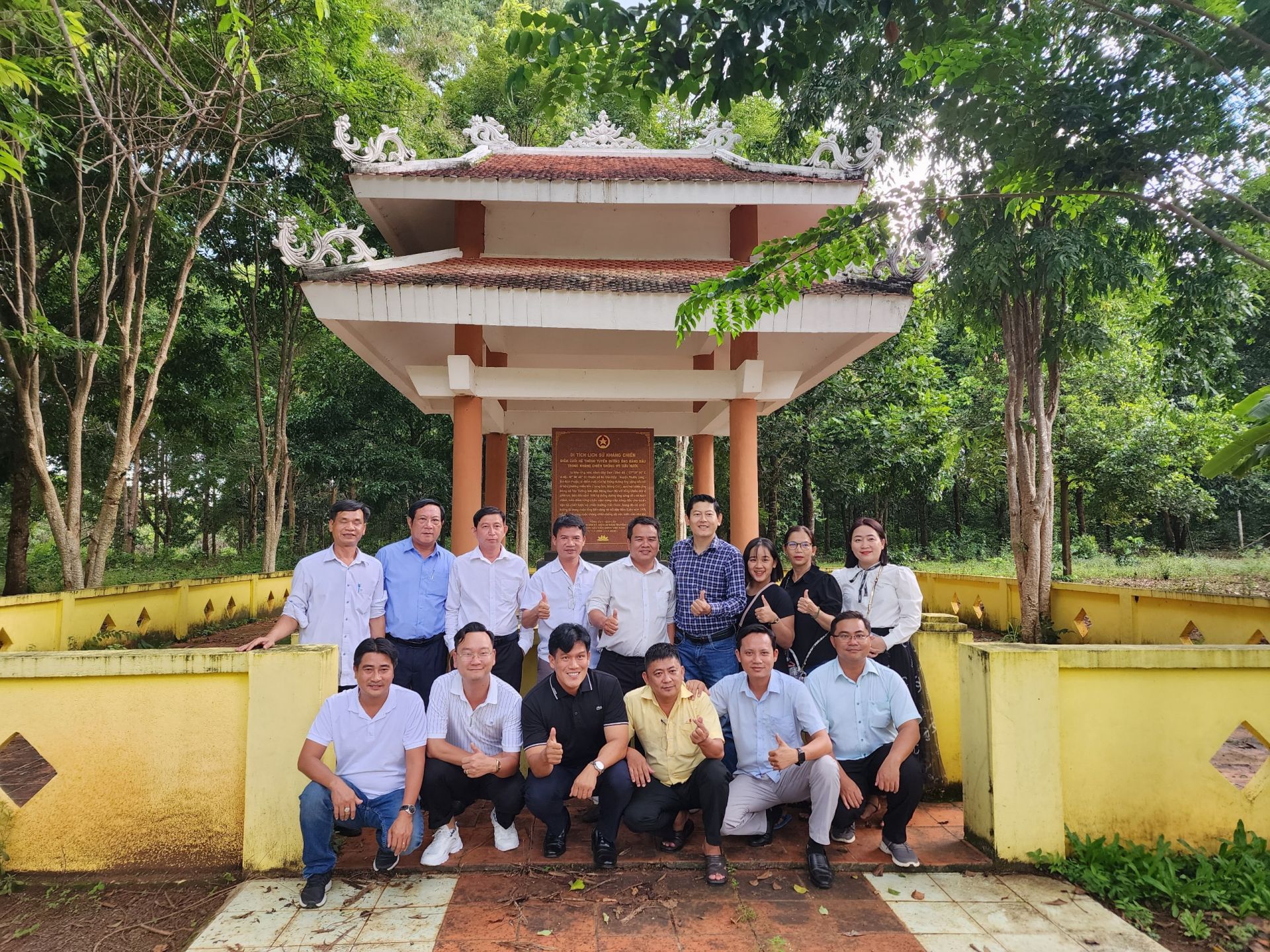 Đoàn khảo sát chụp ảnh lưu niệm tại Di tích lịch sử kháng chiến điểm cuối hệ thống tuyến đường ống xăng dầu trong kháng chiến chống Mỹ cứu nước.