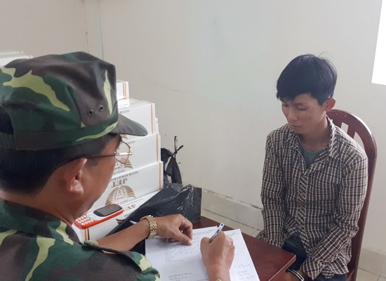 Cán bộ Đồn Biên phòng Mộc Bài lấy lời khai của Lê Thanh Phong.