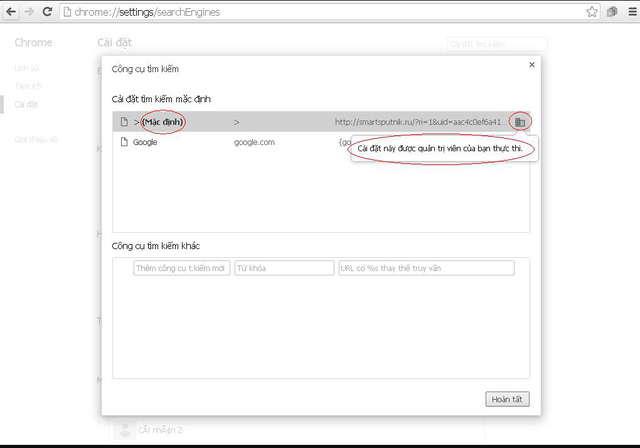 Công cụ tìm kiếm bị thay thế bằng đường dẫn http://smartsputnik.ru khả nghi - Ảnh https://productforums.google.com