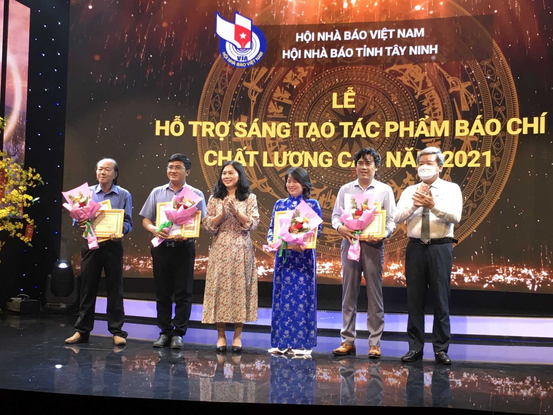 Nhà báo Đồng Viết Thắng (người thứ hai từ phải sang) tại buổi lễ trao hỗ trợ BCCLC năm 2021
