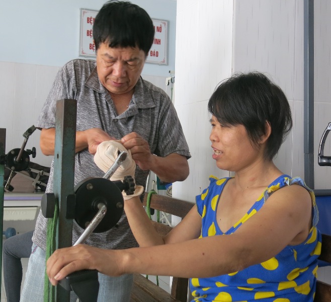Ông Thịnh cùng vợ tập vật lý trị liệu tại bệnh viện.