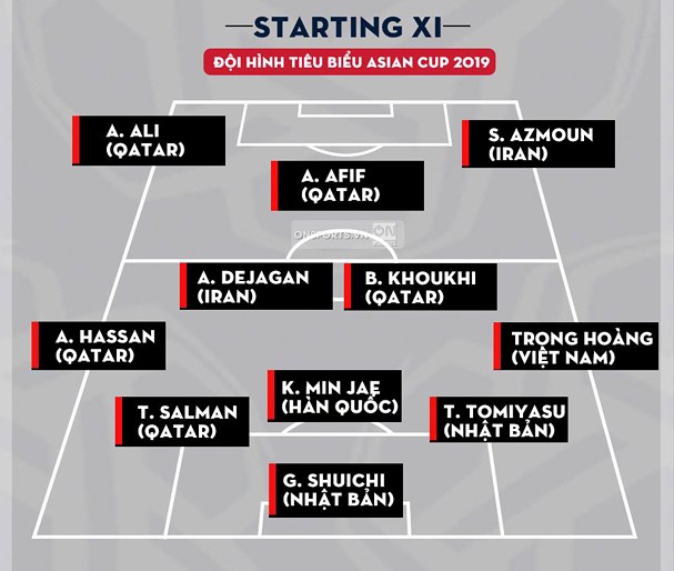 Theo lựa chọn của bình luận viên Rhysh Roshan Rai - kênh truyền hình FOX Sports, Nguyễn Trọng Hoàng là cầu thủ duy nhất của ĐT Việt Nam được góp mặt trong đội hình tiêu biểu của Asian Cup 2019.