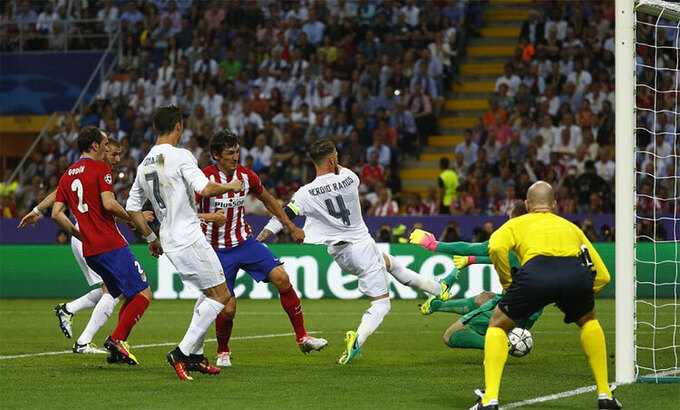 Cuối hiệp hai, Atletico gỡ hòa nhờ cú đệm bóng cận thành của Yannick Carrasco. Sau 120 phút hòa 1-1, Real thắng 5-3 trong loạt đá luân lưu. Đó là trận chung kết Champions League thứ hai liên tiếp Atletico thua Real. Năm 2014 ở Lisbon, họ dẫn 1-0 nhưng để... Ramos gỡ hòa 1-1 vào những phút bù giờ rồi thua ngược 1-4.
