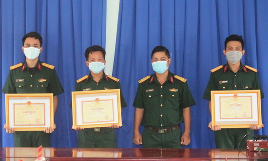 Trung tá Lê Phúc Diện-Chính ủy Trung đoàn BB174 trao thưởng cho các tập thể, cá nhân có thành tích xuất sắc trong phòng chống dịch bệnh Covid-19