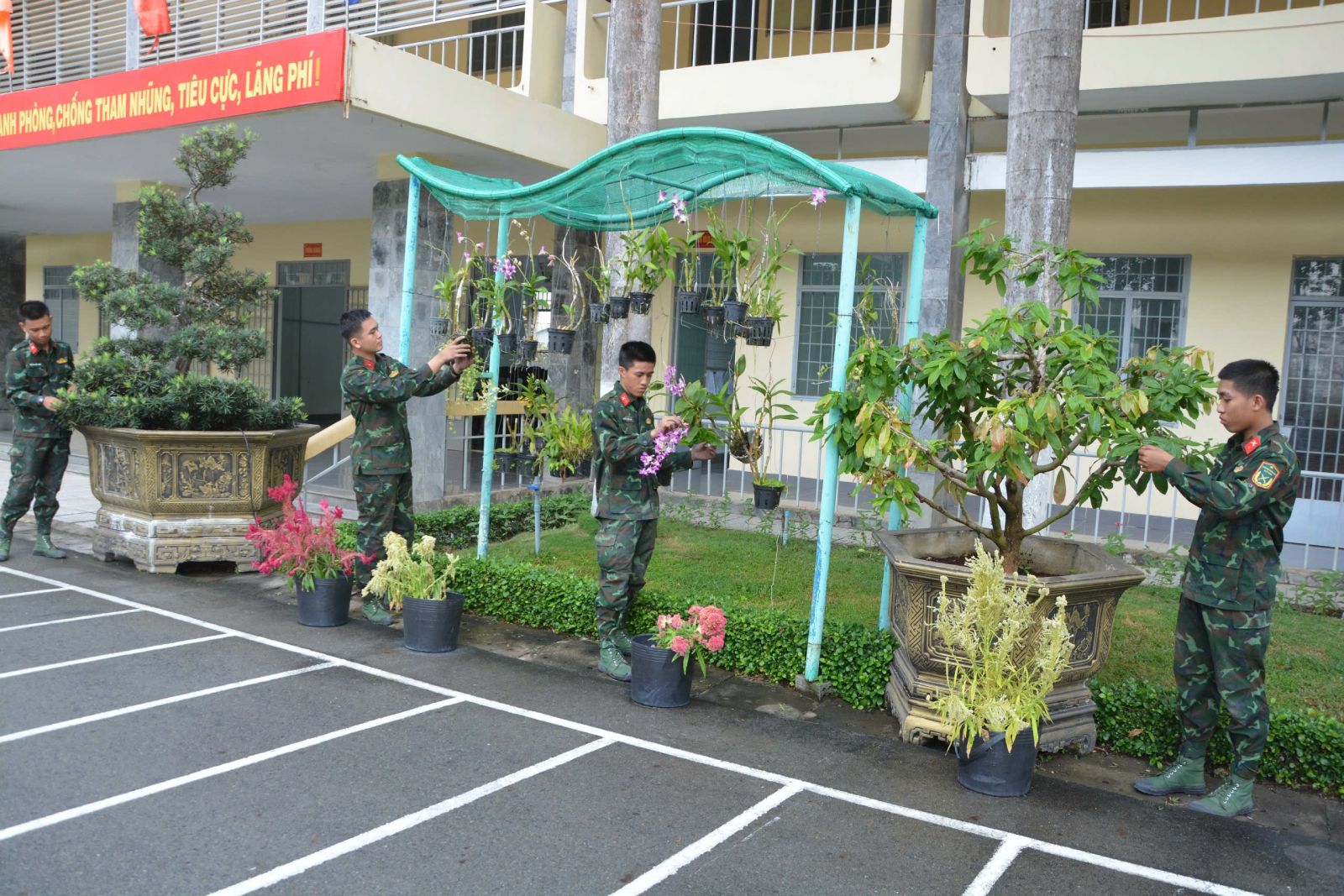 Ngoài công tác chuẩn bị chu đáo, trong khuôn viên của đơn vị được trồng nhiều loại hoa, thảm cỏ, cảnh quan môi trường xanh, sạch, đẹp, hệ thống pa-nô, khẩu hiệu được bố trí gọn gàng, tạo thêm điểm nhấn ấn tượng cho những chiến sĩ mới khi vừa đặt chân đến đơn vị.