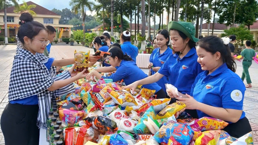 Đoàn viên Đoàn xã Tân Phú chuẩn bị quà bánh cho các em thiếu nhi