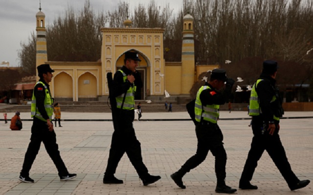 Cảnh sát Trung Quốc tuần tra trước nhà thờ Hồi giáo Id Kah tại thành phố Kashgar, Tân Cương hồi tháng 3/2017. Ảnh: Reurters.