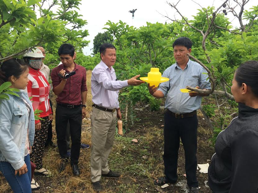 | Cán bộ Viện KHKT Nông nghiệp Miền Nam hướng dẫn nông dân xã Tân Bình kỹ thuật lắp bẫy dẫn dụ ruồi đục trái. |